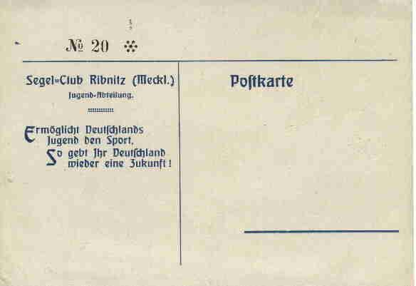 Um die finanzielle Situation des SCR zu verbessern ,wurden schon damals Schritte unternommen, die heute schon -Marketing- heißen. Als Beispiel sehen Sie hier den Verkauf von Postkarten des SCR. Der Schnitt wurde von Dr. Thron gestalltet. Im Hintergrund sieht man noch beide Ribnitzer Windmühlen.